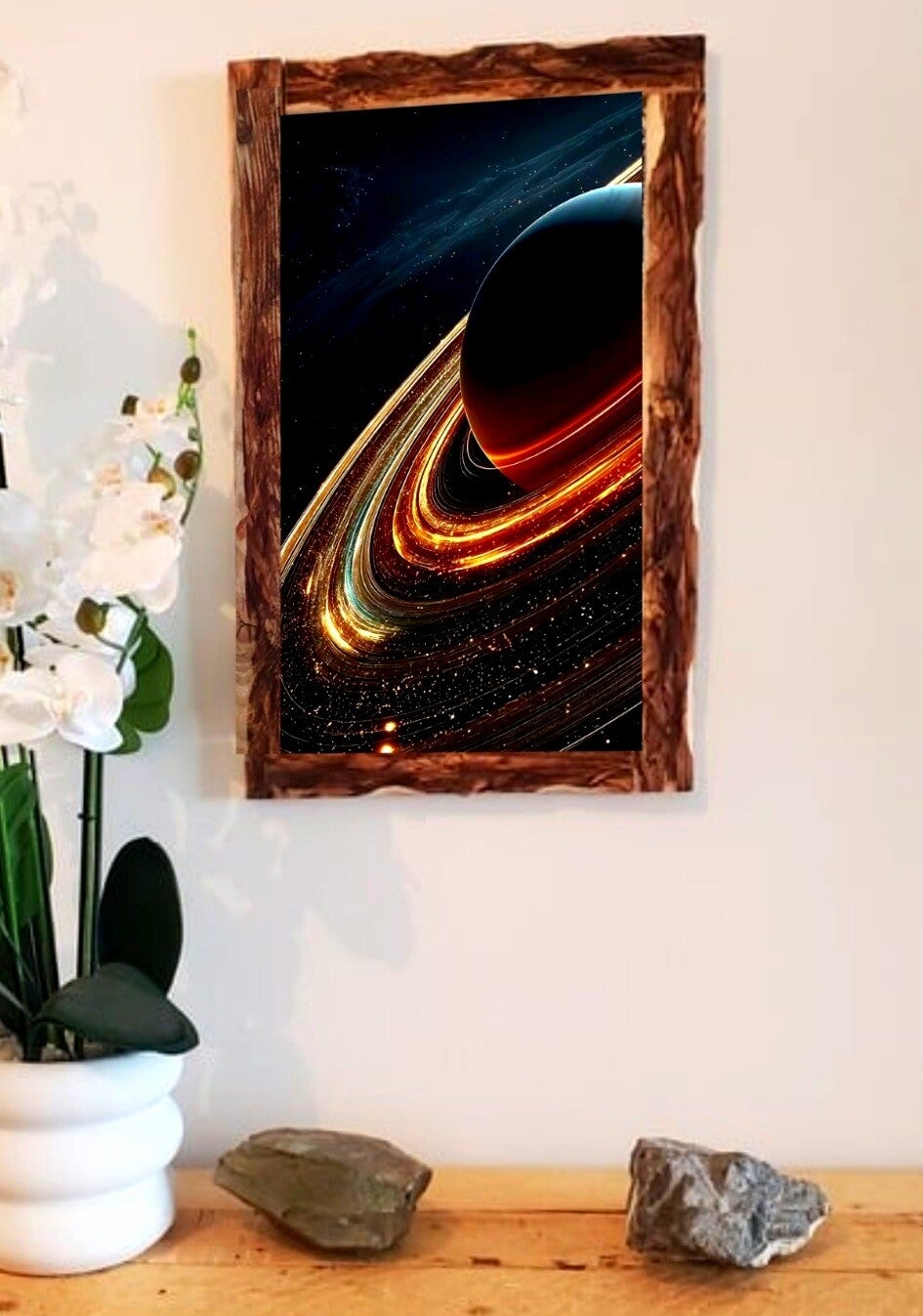 🌌 Tableau sur toile – Planète aux anneaux effet Saturne – Cadre bois