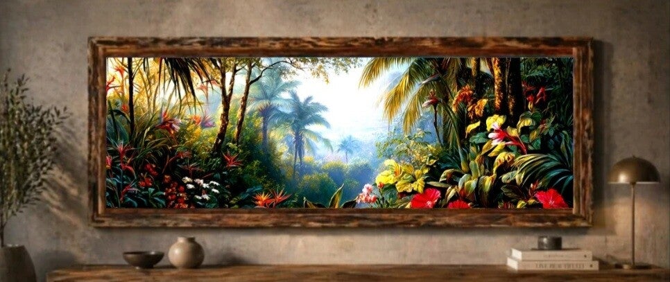 Évadez-vous vers un décor luxuriant avec ce magnifique tableau panoramique représentant une jungle tropicale baignée de lumière. Palmiers, végétation dense et fleurs exotiques se mêlent pour créer une ambiance apaisante et dépaysante. Les jeux de lumière et de profondeur apportent une sensation d’ouverture et de fraîcheur à votre intérieur. Le cadre en bois au style naturel vient sublimer l’ensemble avec chaleur et authenticité.